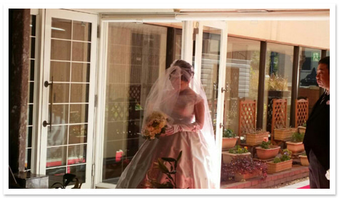 オフショルダーのノーブルなドレスに当店のティアラとグローブを合わせていただきまして